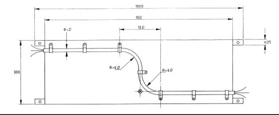 5표본: 표본은 길이 1200mm 이하의 케이블의 부분이며 각 끝에서 100mm의 껍질과 덮개가 제거됩니다.케이블의 양쪽 끝의 케이블은 전기 연결과 제조업체의 권장 사항에 따라 적절히 준비되어야 합니다케이블은 약 같은 길이의 두 부분으로 구부러지고 중간에 평행해야합니다. 구부러진 부분의 지름은 6D입니다.여기서 D는 케이블의 바깥 지름입니다.케이블을 Z 모양으로 형성하고 고정된 끝 사이의 수평 거리는 13D입니다. 그림 6에서 나타났습니다.