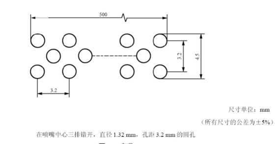 1.32mm 지름과 3.2mm 간격의 세 줄의 분기형 원형 구멍이 노즐 중앙에 배치되어 있습니다.
